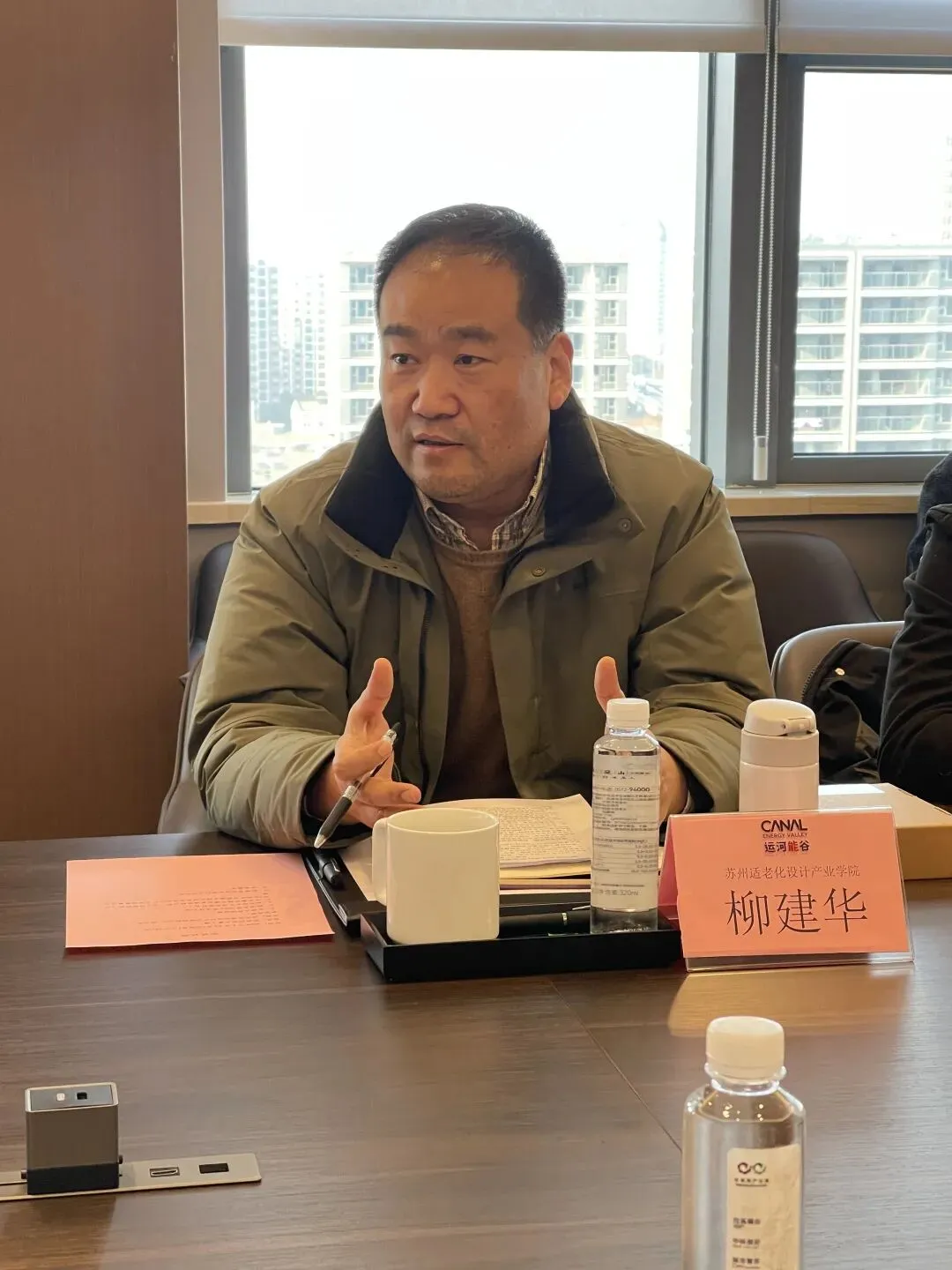 2026年1月23日下午,苏州适老化设计产业学院在苏州阳光大厦召开2025年度总结暨2026年工作展望会议。会议全面回顾了产业学院过去一年在专业建设、教学改革、产教融合与社会服务等方面取得的成果,并系统部署新一年重点工作。适老化设计产业学院院长、环境艺术学院负责人柳建华,苏州市养老产业联合会会长、产业学院副理事长徐冈,秘书长沈玉彬,以及来自苏州互联金秋健康管理有限公司、苏州久久春晖养老服务有限公司、中交豪生城市建设发展有限公司、三三智能科技(苏州)有限公司等理事单位代表出席会议。会议由沈玉彬主持。