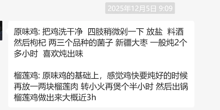 看房那天,天气很好,一切很顺,很快就定好了房子,签了合同,几天后的清晨,我们就搬了过来。我们两个人都是大学一毕业,就从老家来到了上海。工作多年后,收入在同龄人里都不算低的,当然也没多高。和上海的房价比,都不过是杯水车薪。想要在上海定居安家,遥遥无期。苏州只要不在市区,不在网红打卡点,人就少多了,节奏慢,房价低许多。所以干脆一不做二不休,先搬过来体验一年看看,不适应的话就再说。先过来住住看,看看城市和自己合不合适,合适就留,不合适就下一个好了。刚开始的时候,也就是吃吃喝喝,逛逛玩玩,办了园林卡,去了一些景点和餐饮店打卡。只是时间久了,总觉得哪里怪怪的,毕竟没有在苏州上过班。不过我们已经做好最坏的打算,如果在苏州找不到合适的工作,那就坐高铁回上海上班——早已调查过,不少人都是这样双城生活的。没想到,11月下旬的一个决定,改变了我们过往的生活方式,让我们以最快的速度融入了本地生活里。开始摆摊之前,没有想太多,只是觉得这个鸡我们自己吃了很满意,拿去炖汤和红烧都好吃,卖给全国各地的客户,她们吃了也是赞不绝口,那就试试去摆摊卖吧,也不知道当地人会不会喜欢。上面的聊天记录是一个兰州的朋友在群里说的。她很喜欢我们家老母鸡,喜欢炖鸡汤吃,这里分享一下她的菜谱⬇️而我选择去摆摊卖我们土鸡,最坏的结果不就是卖不掉,放家里,自家慢慢吃吗?没事滴。反正我很喜欢吃小鸡炖蘑菇,第一次用这个鸡做了就好吃到光盘,实在太好吃了!当我真的去摆摊后,发现我们土鸡很受当地人欢迎,无论是苏州本地人,还是外地人,都很喜欢。嘴刁的客户都忍不住猛夸这个鸡肉太好吃了,要给爸妈也来一只尝尝⬇️路子是走出来的,不是光想就够了。路通不通,东西行不行,必须亲自去做了才知道。也是因为摆摊,我前几天吃到了苏州甪(lù )直特产,一个是萝卜干,一个是豆腐乳,都超好吃!我还学会了凉拌海蜇,头一次做,味道也不错,做起来简单方便。不过我技术有限,做不出饭店里的那个味道,等我多练习几次再说——第一次做手抖,山西陈醋倒多了,搞得很酸
