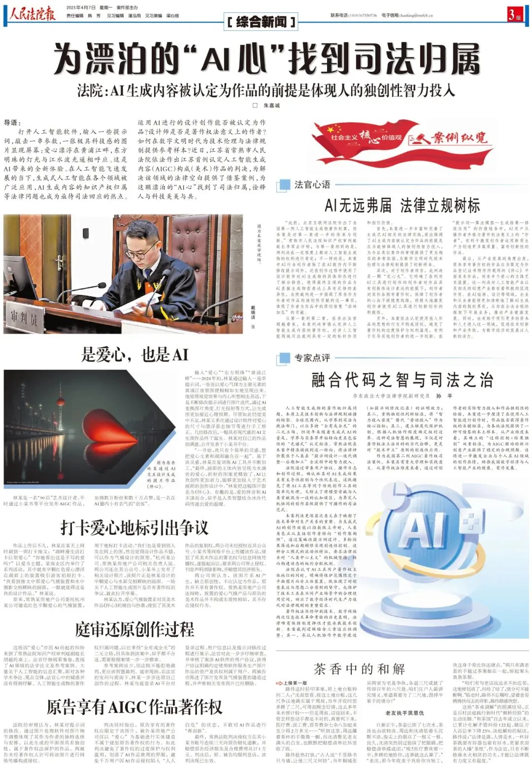 常熟实践:审结的全省首例人工智能生成物作品著作权案件,受到央视等多个国家级媒体关注报道,入选服务保障长三角数字经济高质量发展典型案例。
