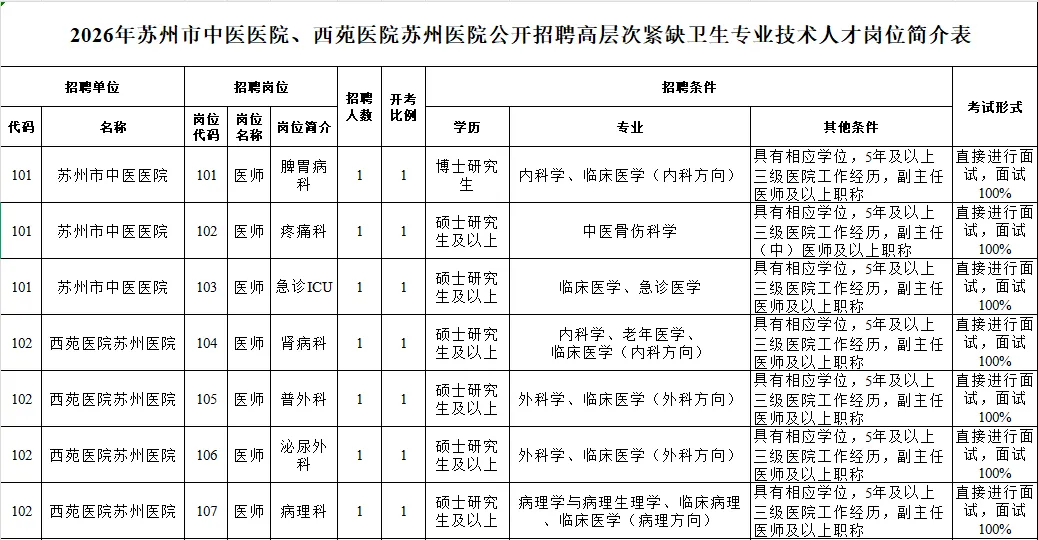 根据《江苏省事业单位公开招聘人员办法》(苏办发〔2020〕9号)有关规定,经研究决定,2026年苏州市中医医院、西苑医院苏州医院面向社会公开招聘高层次紧缺卫生专业技术人才7名(事业编制)。现将有关事项公告如下: