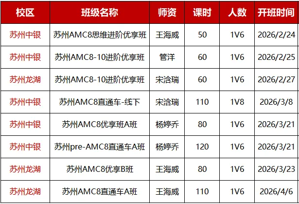 苏州AMC8培训课程在工业园区和龙湖中心均有校区,线上线下同步开班,具体课表如下: