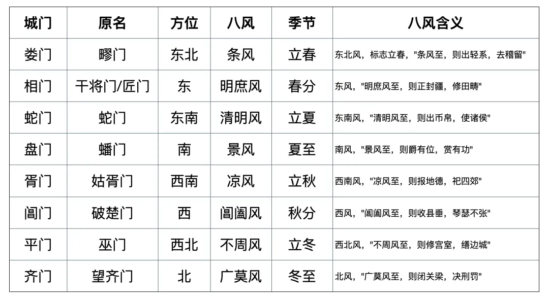 - 其余六门依八风方位排布:东方娄门、匠门对应条风、明庶风(主生发),南方盘门对应景风(主兴盛),西南胥门对应凉风(主收敛),西北、北方城门分别对应不周风、广莫风(主闭藏),形成 “八风绕城,天象入郭” 的格局。