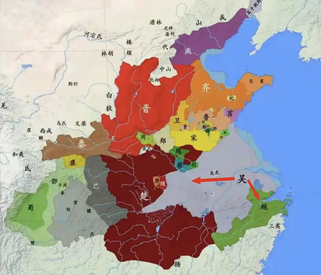 此外,《太平御览》更有补注:“吴位辰,属龙,故小城南门作龙,以厌蛇气也”,由此增添了 “龙制蛇” 的具象意象来压制越国。公元前 506 年,吴、楚爆发了柏举之战,当时的吴、越、楚三国的形势图:如果说陆门是 “象天” 的具象化,那么八座水门便是 “法地” 的核心实践。《吴越春秋》所载 “水门八,以法地八聪”,“八聪” 指八方地气与信息,伍子胥结合苏州水乡特质,让水门既适配地理环境,又暗合天地秩序。由于年代久远,部分历史细节仍存在考证困难,如小城 "不开东面" 的具体含义、八门与八风的精确对应关系等,需要更多考古发现和文献研究来进一步澄清。