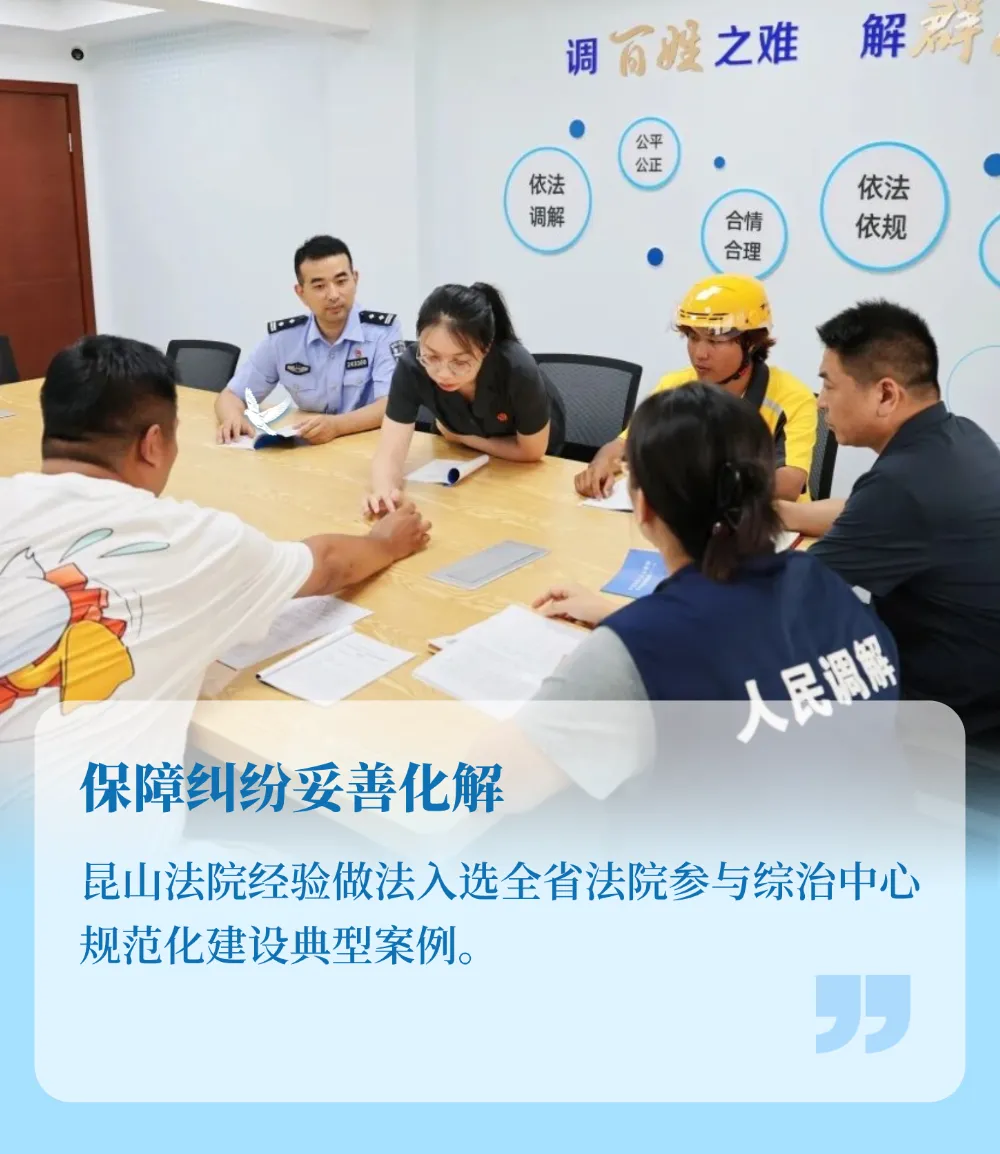 昆山法院创新“一中心多站点”参与综治中心建设模式,开设立案服务窗口,组建“法官+调解员”团队入驻,提供全流程解纷服务。“深化类型化纠纷解决机制,助推社会综合治理建设提质增效”工作经验入选全省法院参与综治中心规范化建设典型经验。