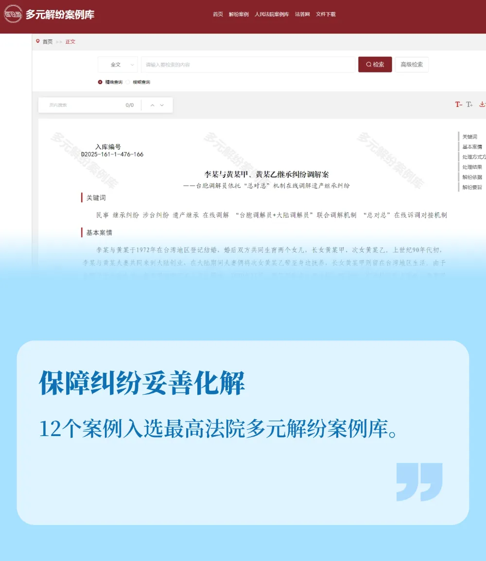 “李某与黄某甲、黄某乙继承纠纷调解案”“刘某与杨某离婚纠纷调解案”“吴某与赵某财产损害赔偿纠纷调解案”等3个案例被全国法院多元解纷案例库收录,数量居苏州基层法院之首。