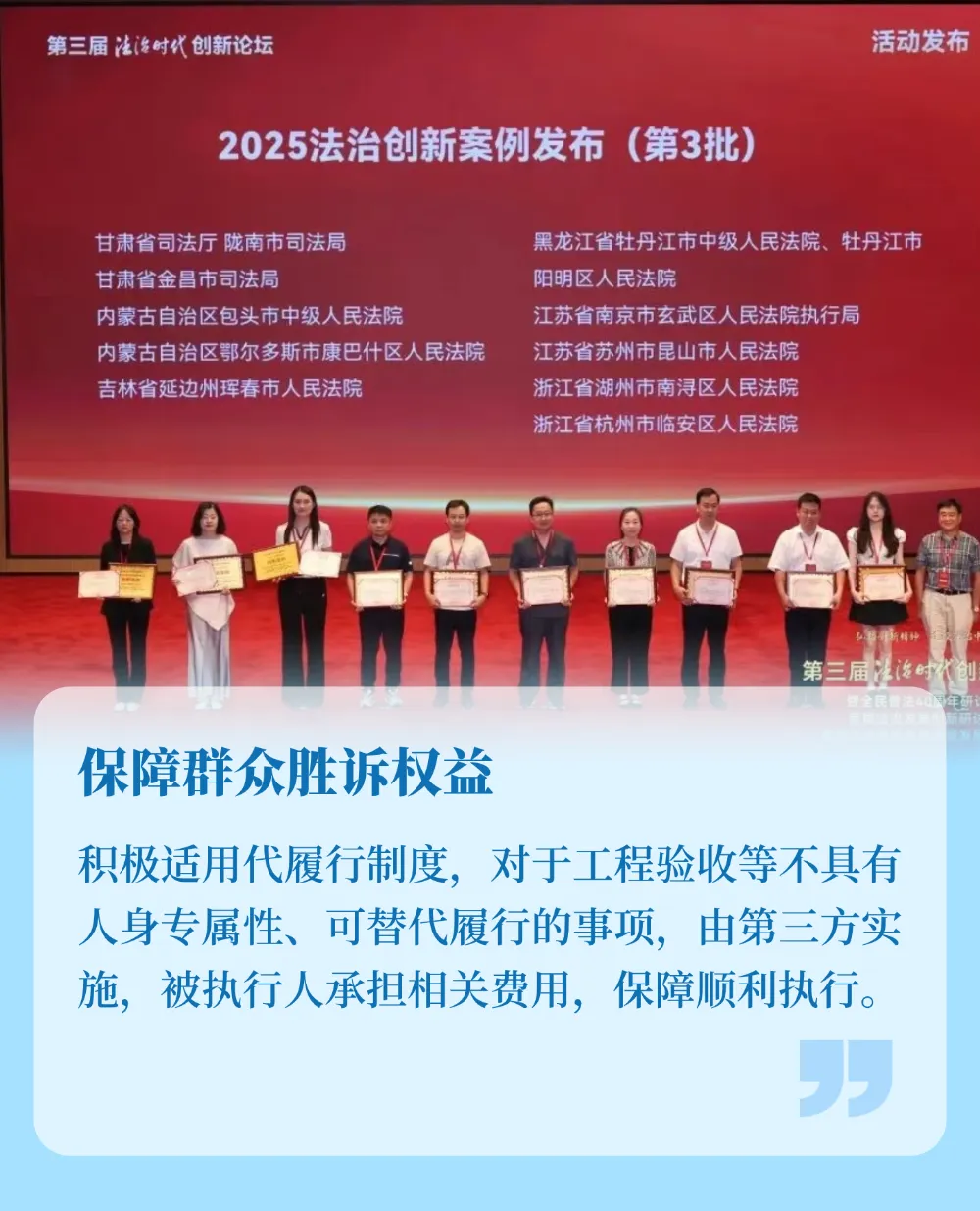 在某行为类执行案件中,承包人拒不履行生效判决确定的配合工程竣工验收义务,导致新厂房无法投入使用,拟签约企业无法入驻。昆山法院创新引入“执行代履行人”机制,选定第三方机构代为履行竣工验收义务,为可替代行为类执行提供了可复制、可推广的新路径。该案例被《人民法院报》头版、最高法院官微报道,获评2025年度人民法院工作创新案例。