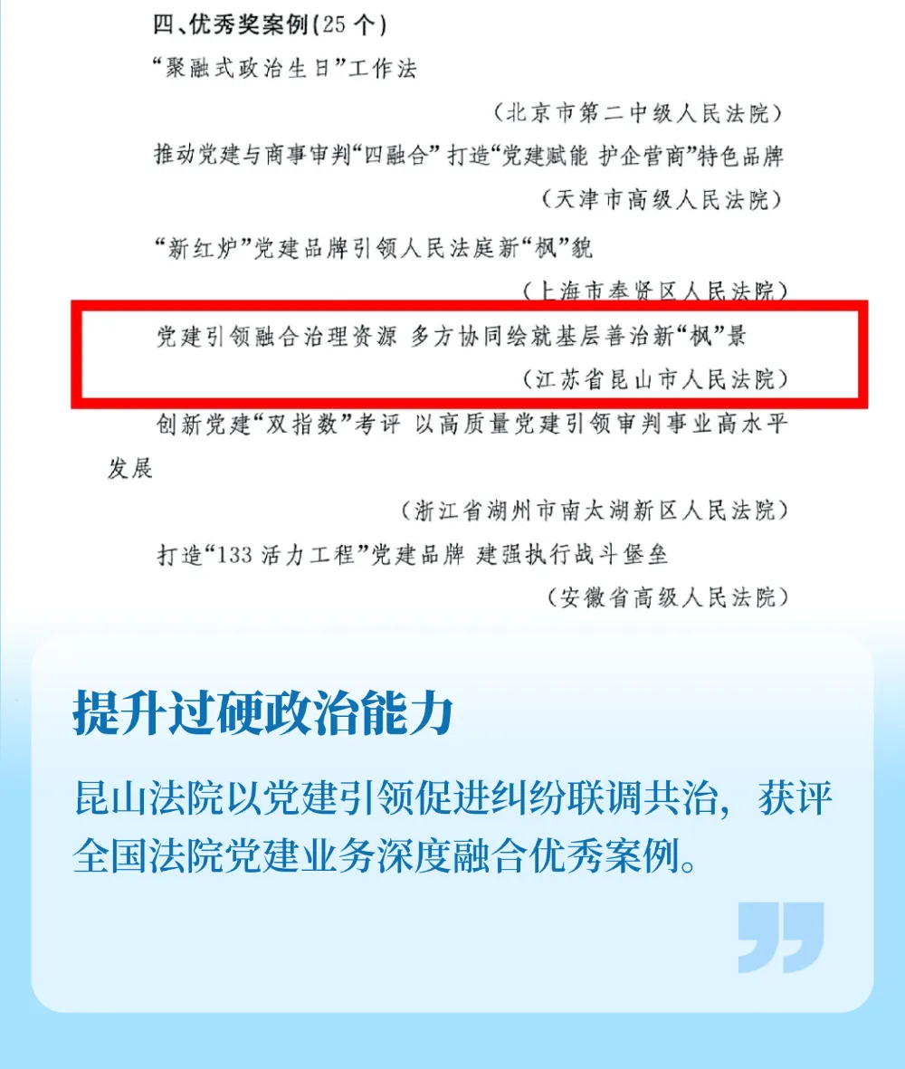 昆山法院持续推动党建和业务双促双融,“党建引领融合治理资源 多方协同绘就基层善治新‘枫’景”获评全国法院党建业务深度融合优秀案例,系全省唯一入选的基层法院案例。
