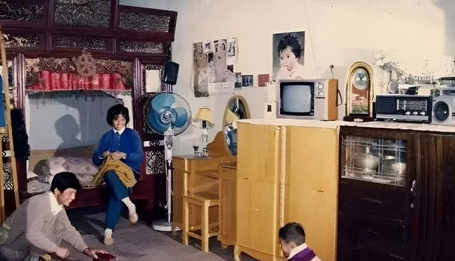这屋里摆着的小彩电、电扇和收音机,是那时最体面的“三件套”,柜子上还贴着明星海报,父亲蹲在地上逗孩子,母亲坐在架子床边打毛衣,玻璃橱里叠着搪瓷缸和不锈钢盆,虽然简单,家里却亮堂堂的。