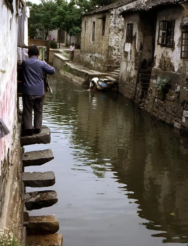 这个贴着墙探出去的石台阶,老苏州叫跳墩,雨天防滑,晴天洗衣,左手拎桶右手拽绳,脚尖一点就能下到水边,小时候我跟在姨妈后头,她总说别往外探太多,小心打滑。