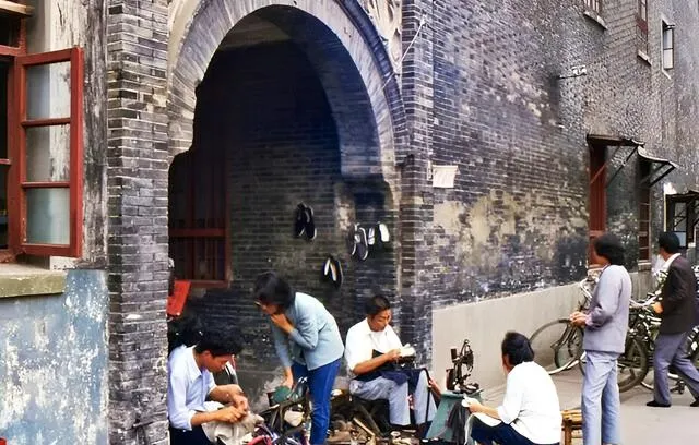 这拱形门下摆的,是修鞋缝补的小摊位,几把老式脚踏机,边上挂着鞋底和线团,师傅嘴里叼着粉笔画线,咔嚓咔嚓踩几脚,针线就稳稳落下了,当时没有快递上门,这样的摊子离生活区近,受人欢迎。