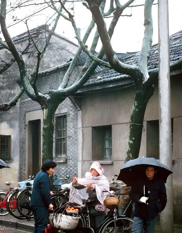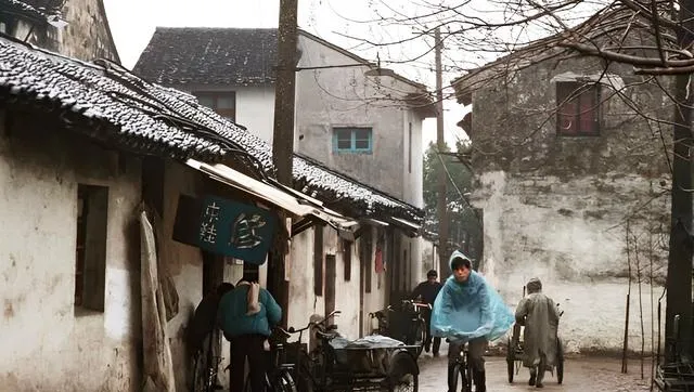 这条巷子里的人披着塑料雨披骑车,小店檐口挂着“鱼”字招牌,屋瓦淋得黑亮,车轮碾过水坑会溅起细小水花,那时候没有共享伞,大家各自收拾利索,雨再大也得赶路。
