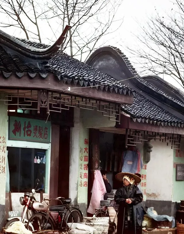 这个带月牙形飞檐的门面,是理发店和杂货铺一排连着的街市,木窗漆成墨绿,门口停着二八大杠,自行车前篮里塞着麻绳和菜叶,卖东西的大嫂戴着斗笠站在檐下,雨一来就把摊子往里拖一拖。