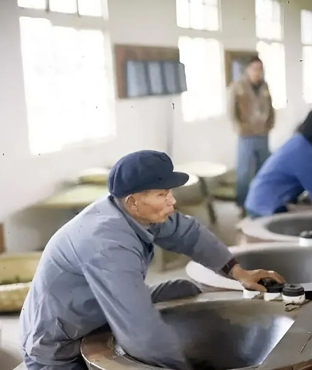 图里老人正用手炒茶,铁锅被油光养得铮亮,茶叶在锅里翻跳,香味顺着窗缝往外跑,师傅手背起了薄茧,他笑说这点热不算啥,等翻红心就行,现在买茶多是流水线,手作的火候,懂的人一闻便知道。