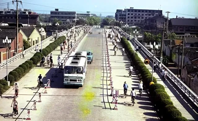 这是人民路的景象,路宽笔直,公交车从中间慢慢过,自行车分流骑两边,隔离桩一串串排着,远处的楼房不高,天空却开阔,现在车子多了,路也更讲究秩序。