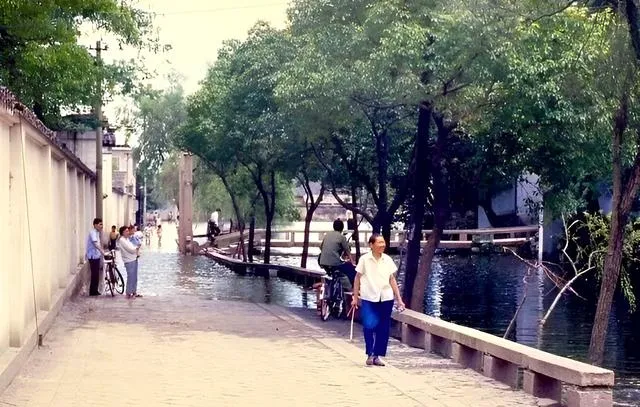 这条靠着园林的路水涨上来,沿岸木栈道被淹了一截,行人提着裤脚绕着走,自行车推着过,石栏杆上滴着水,园林里头的松影被水光照得发亮,城和水互相牵着,不急不躁。