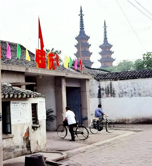 这张是国庆时分,单位门楼上插着彩旗,红色的“国庆”两个字站在屋脊上,巷口的自行车一辆接一辆,抬眼就能看见远处的双塔,风把旗子吹得猎猎作响,热闹不必喊。