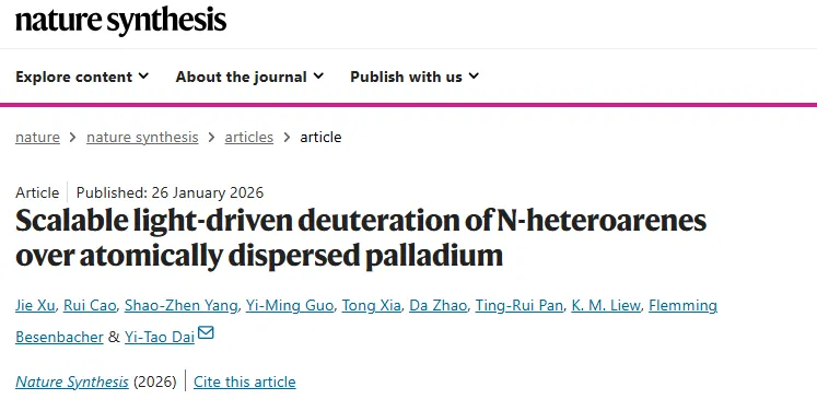 中国科大苏州高等研究院戴懿涛老师课题组制备了钛白粉负载原子分散钯位点的光催化剂(Pd₁/TiO₂),该催化剂在可见光照射下可形成激发态,能在室温、1 bar氩气氛围下活化氮杂芳烃的碳-氢键,从而在重水中实现难度较高的氢同位素交换反应。