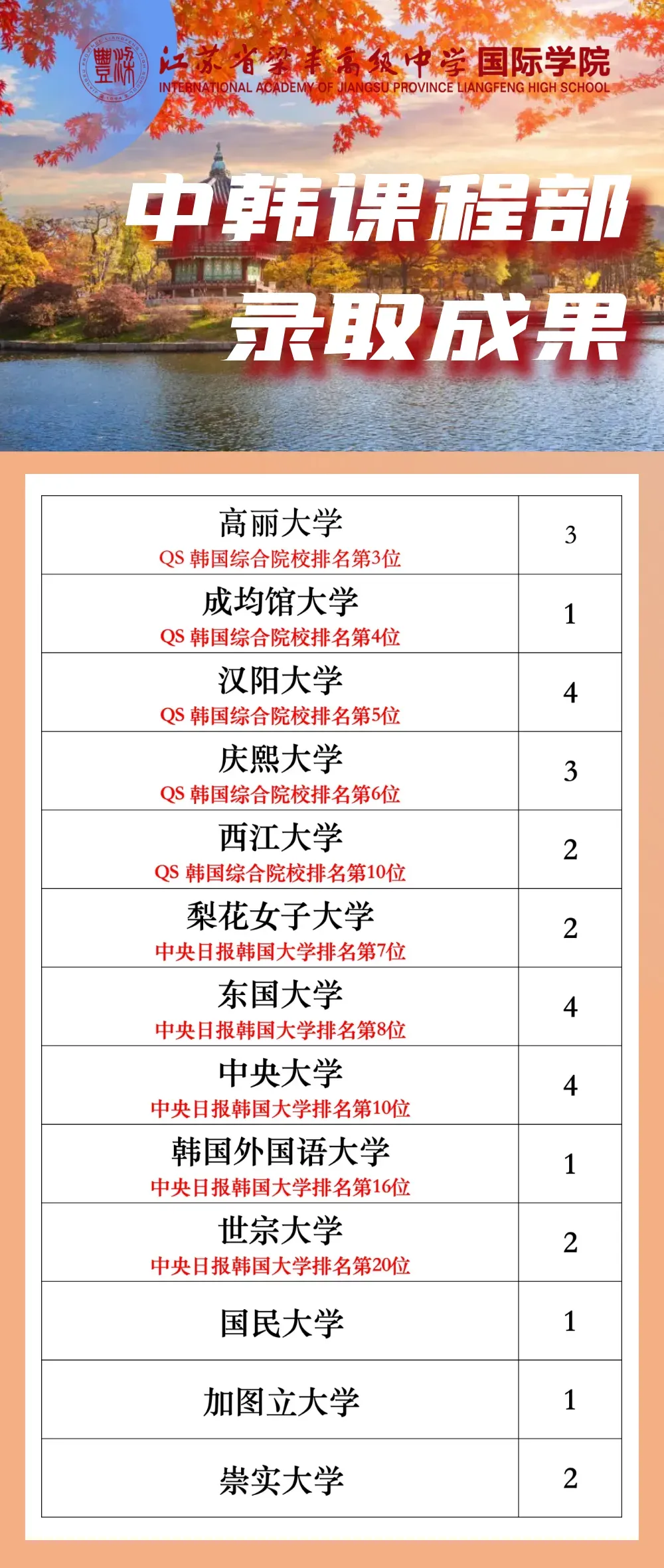 优异的成绩换来他们在韩国大学录取上的辉煌成果,赴韩毕业生目前全部被韩国知名高校录取,其中包括韩国排名第三的高丽大学,第四的成均馆大学,第五的汉阳大学,世界规模最大的女子大学梨花女子大学,韩国戏剧影视表演最高学府中央大学,首尔之心艺术殿堂的庆熙大学,亚洲排名第一的外国语大学韩国外国语大学,酒店管理专业亚洲第一的世宗大学,韩国最早的综合性大学之一的东国大学,韩国最早的西式高等教育机构加图立大学等。这实现了他们长久以来的梦想和追求,也是中韩课程部教学质量的有力佐证!