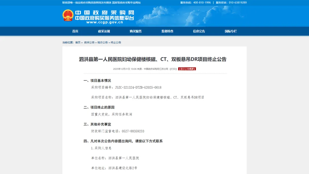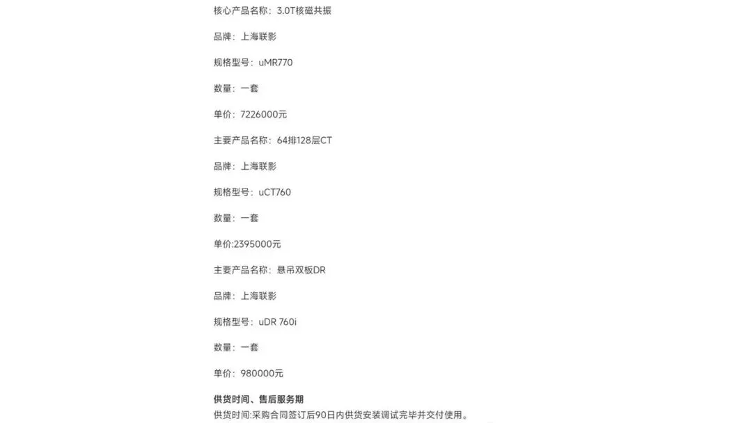 以最近被终止的江苏宿迁泗洪县第一人民医院的项目为例,原本采购计划包括一台 3.0T高场强磁共振(MRI)、一台 64排计算机断层扫描(CT) 和一台 双板悬吊数字X射线摄影系统(DR),全部由联影的产品中标。