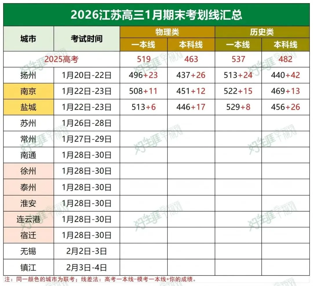 本次盐城、南京高三期末(一模);扬州高三期末统考划线已出。物理类:特招线508分;本科线451分