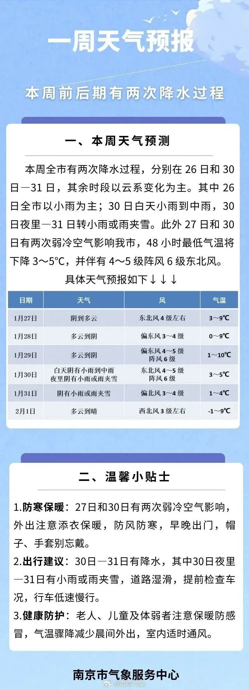 另外,27日沿江以北部分地区、2月1日苏南部分地区可能有雾。