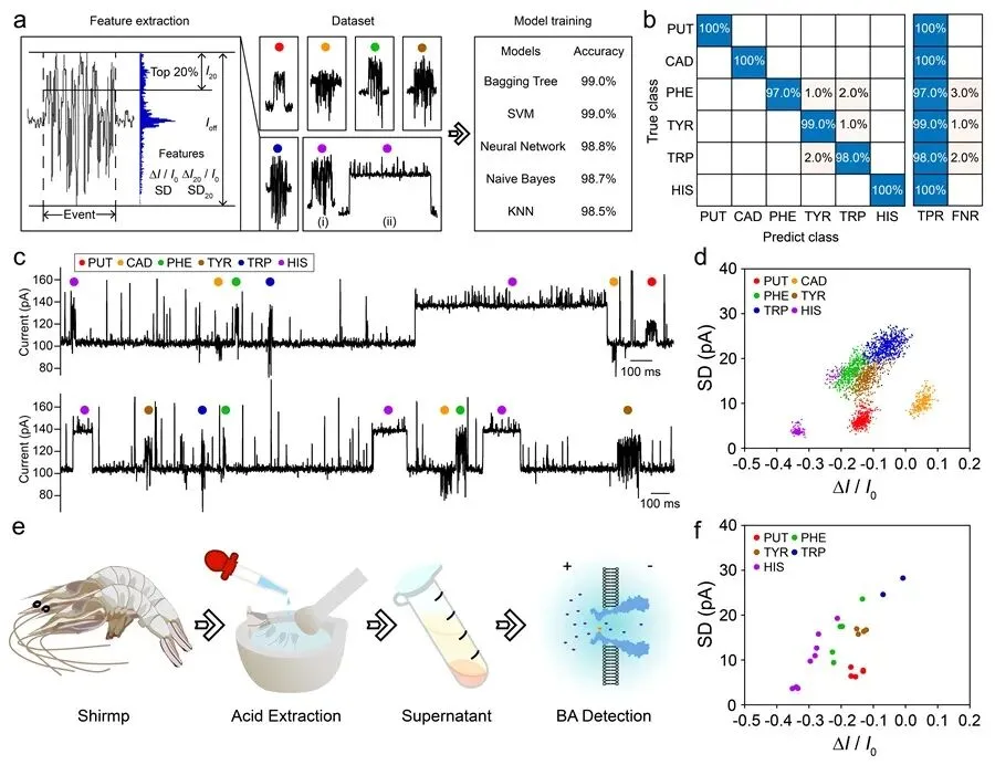 进一步,研究团队提取生物胺传感事件的四种特征,使用机器学习模型六种生物胺进行分类,整体分类准确率可达99.0%(图2a, b)。该机器学习模型可以对六种生物胺混合样品的传感事件逐一识别(图2c, d)。最终在虾肉样品的提取液中同样可以检测到多种生物胺事件,并且可以被机器学习模型准确分类(图2e, f),定量结果也与LC-MS相匹配,说明此方法具有检测食品当中的生物胺组分的能力。
