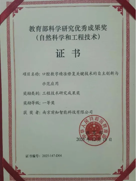 近日,南京前知智能科技有限公司喜获教育部科学研究成果一等奖,凭借“口腔数字精准修复关键技术的自主创新与示范应用”项目,荣获2025年度教育部科学研究成果奖(自然科学与工程技术)一等奖,彰显其在口腔数字化修复领域的领先实力。