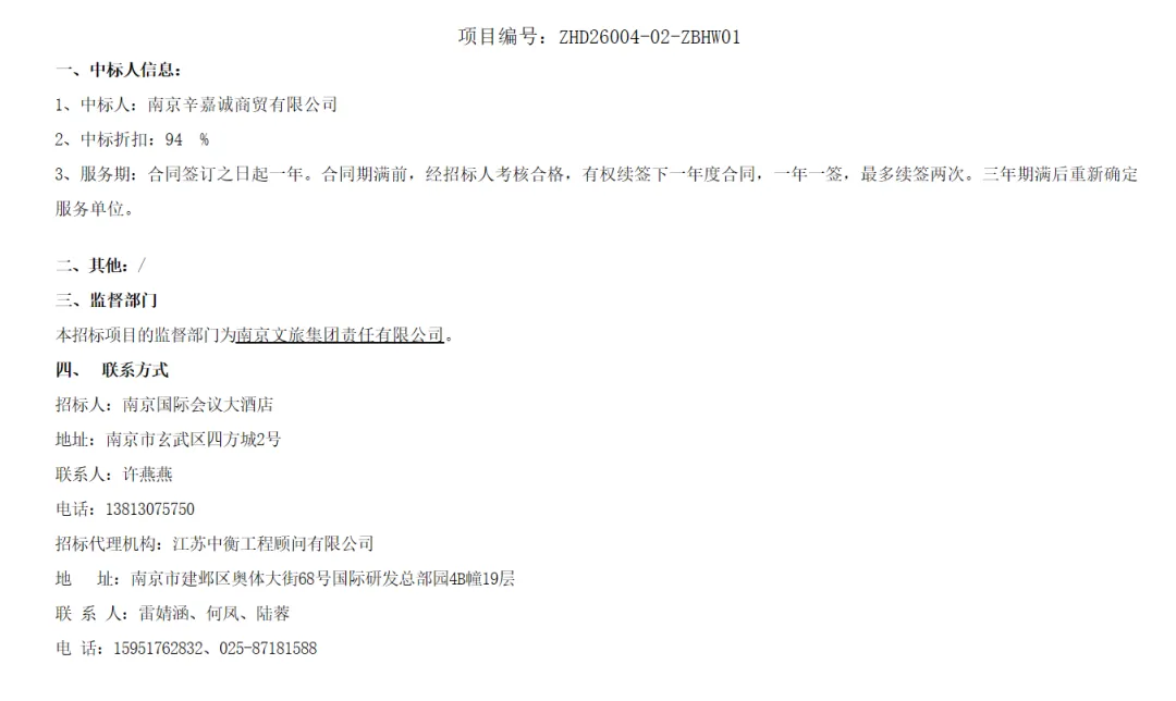南京国际会议大酒店原材料采购中标结果公告