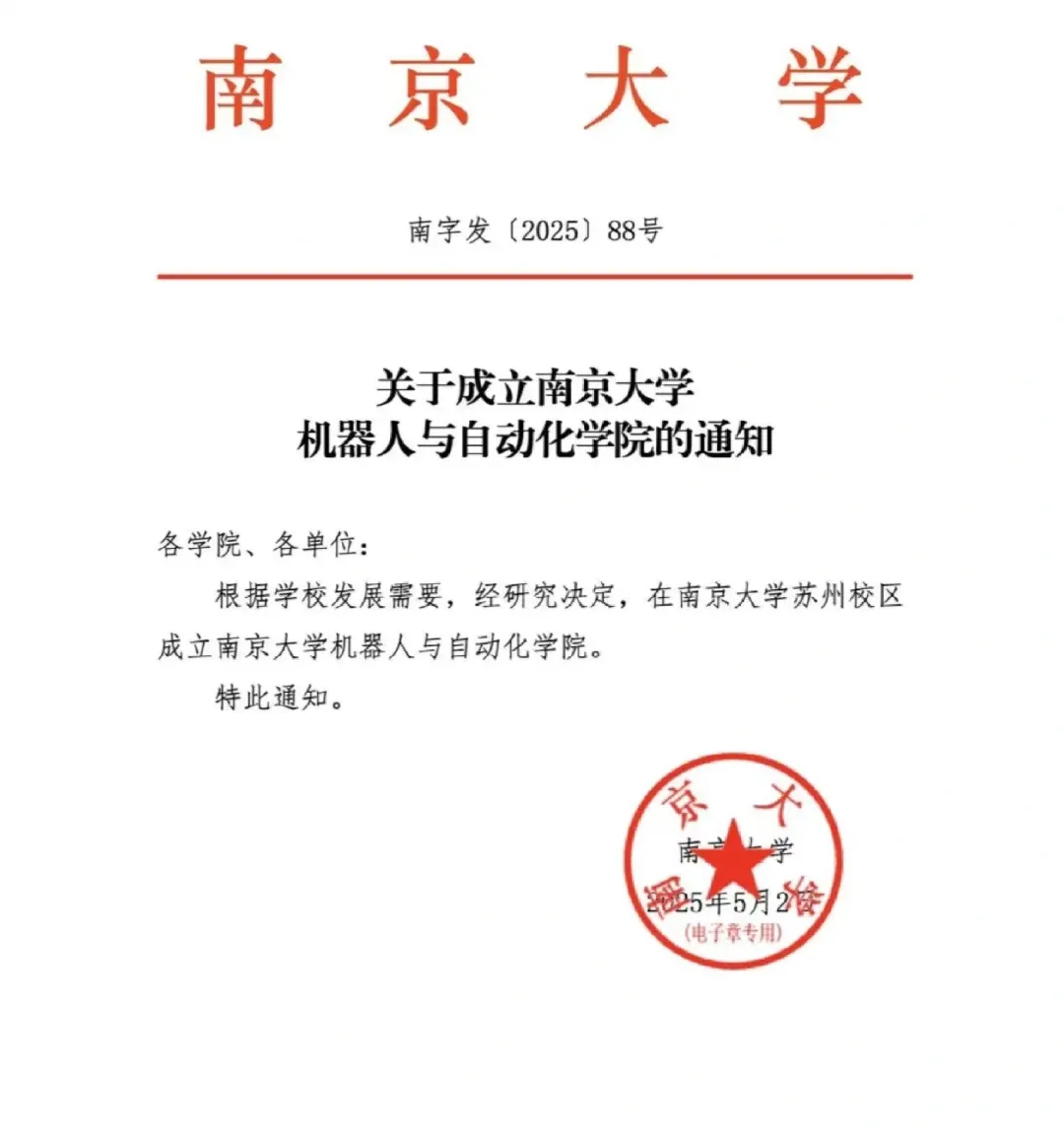 而在2025年5月,南京大学又发布了关于成立机器人与自动化学院的通知,下设控制工程、控制科学与智能工程两个招生专业。