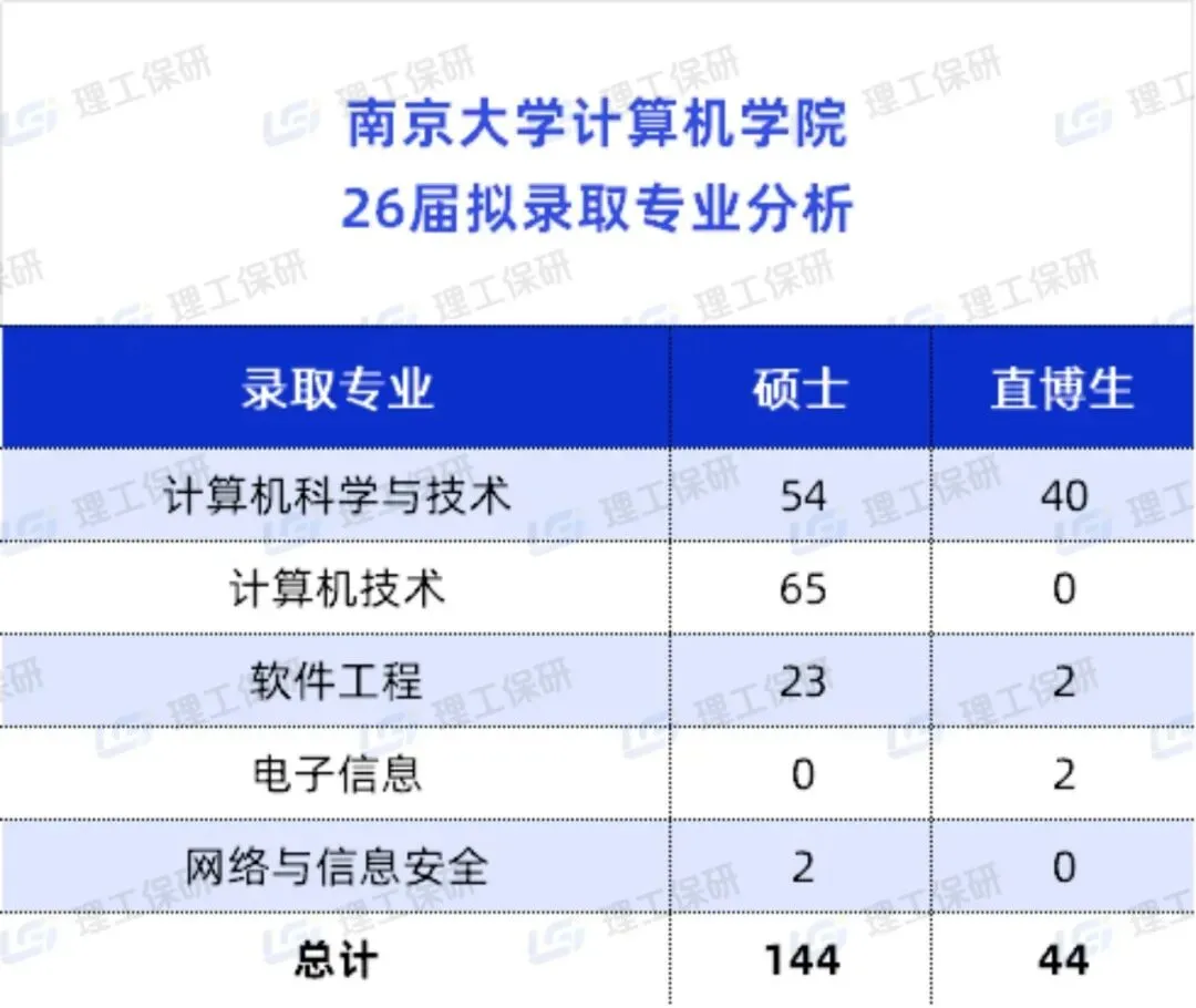从南京大学计算机学院2026届推免生拟录取情况来看,拟录取硕士144人,直博生44人。整体而言,学院推免招生以硕士为主,在核心的计算机科学与技术专业重点布局了博士人才培养。