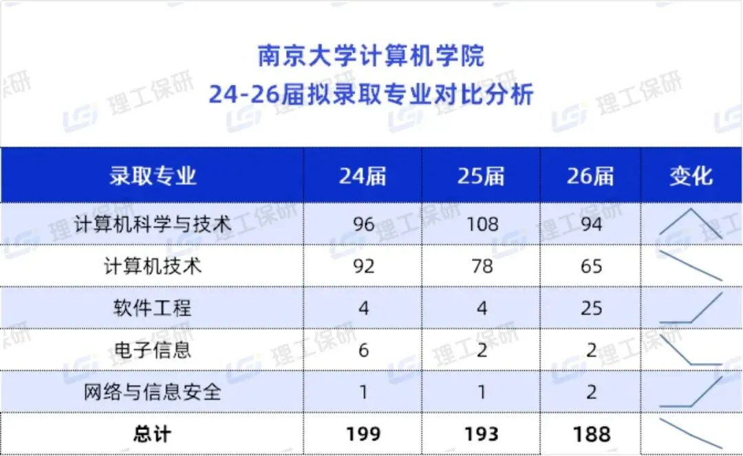 对比计算机学院近三年录取情况发现,总录取人数呈小幅下降趋势,从24届的199人降至26届的188人。