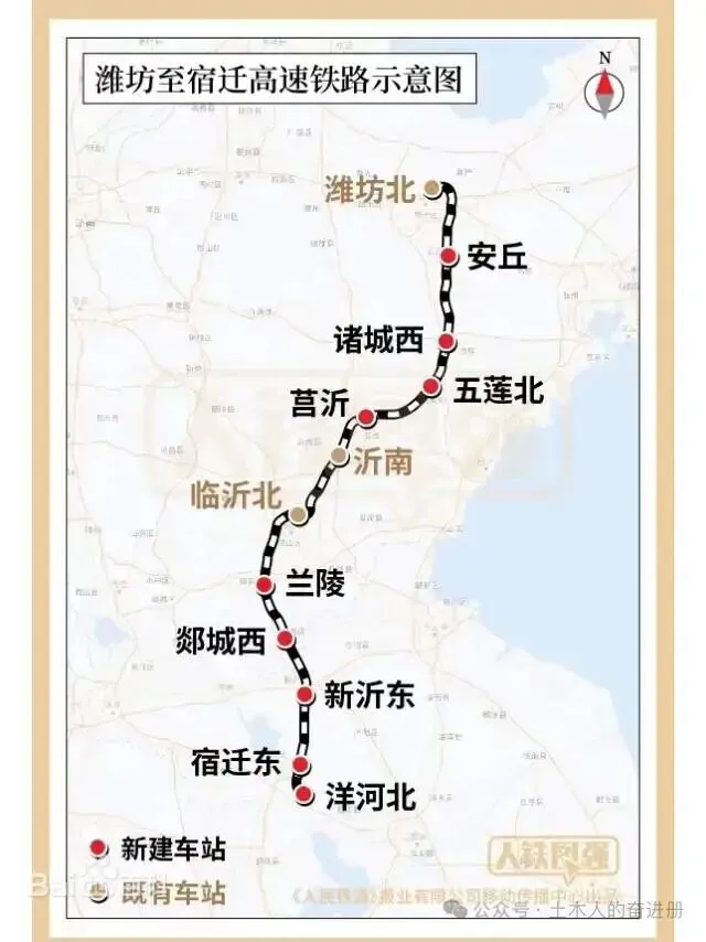 据悉,潍宿高铁是国家“八纵八横”高铁网京沪高铁辅助通道的重要组成部分,线路自山东潍坊北站引出,途经潍坊市、日照市、临沂市,江苏省徐州市新沂市,终至宿迁市洋河北站,正线全长约399公里,其中新沂段约33.45公里。