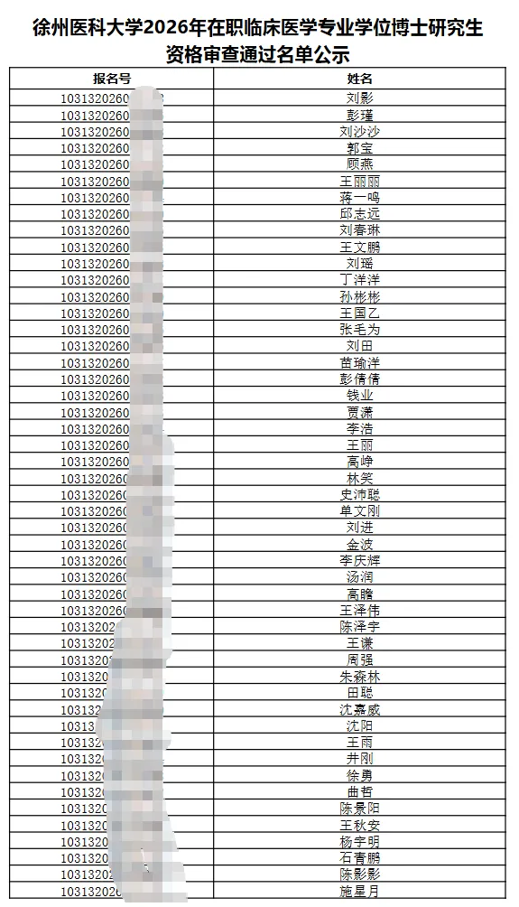 徐州医科大学2026年在职临床医学专业学位博士研究生资格审查通过名单公示