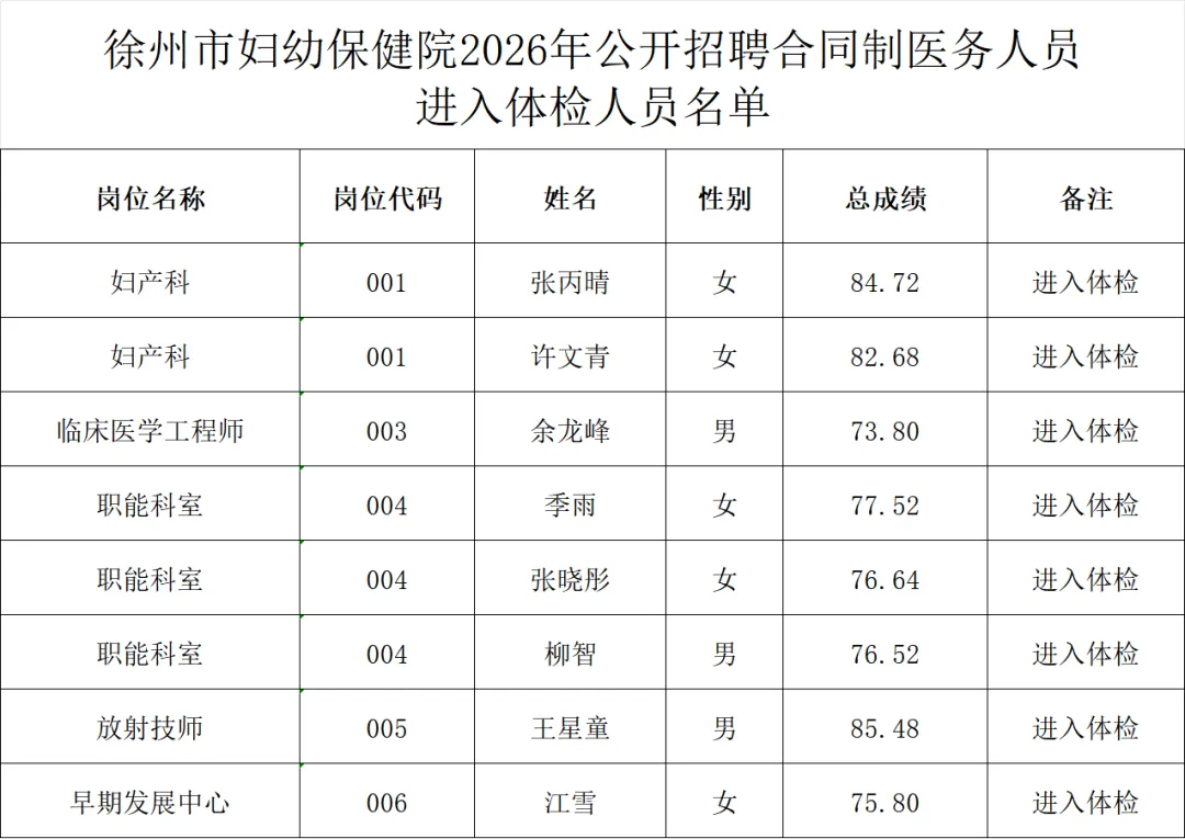 根据《徐州市妇幼保健院2026年公开招聘合同制医务人员公告》要求,经笔试及面试,下列人员进入体检程序(名单附后)。现将体检有关事项通知如下:
