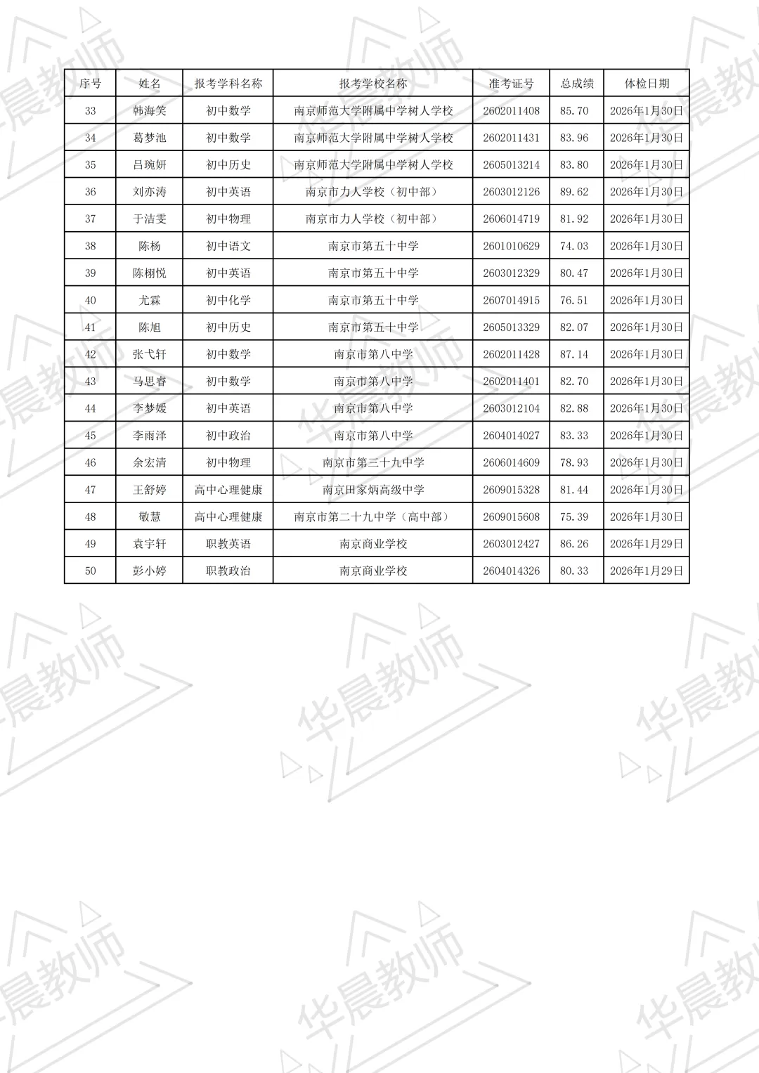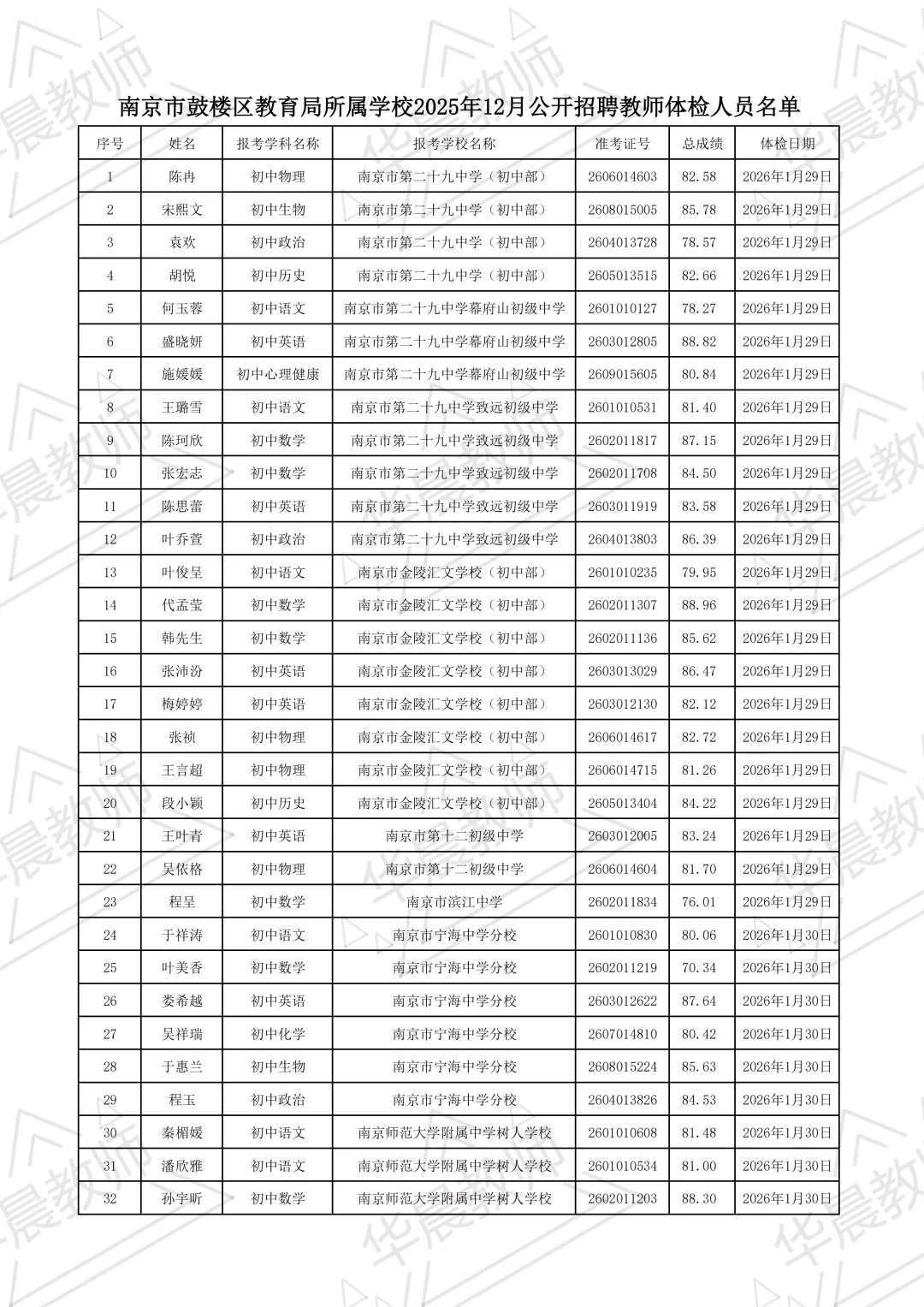 根据《南京市鼓楼区教育局所属学校2025年12月公开招聘教师公告》精神,经报名、笔试、资格审查和面试,根据招聘岗位计划1:1,按总成绩由高到低,现将体检人员名单公布如下,具体人员名单见附件1《南京市鼓楼区教育局所属学校2025年12月公开招聘教师体检人员名单》。请相关人员按照体检日期安排携带身份证于中大医院健康管理中心现场缴费参加体检,体检登记时间:上午7:30—9:00。体检具体要求见附件2《中大医院健康体检须知》。