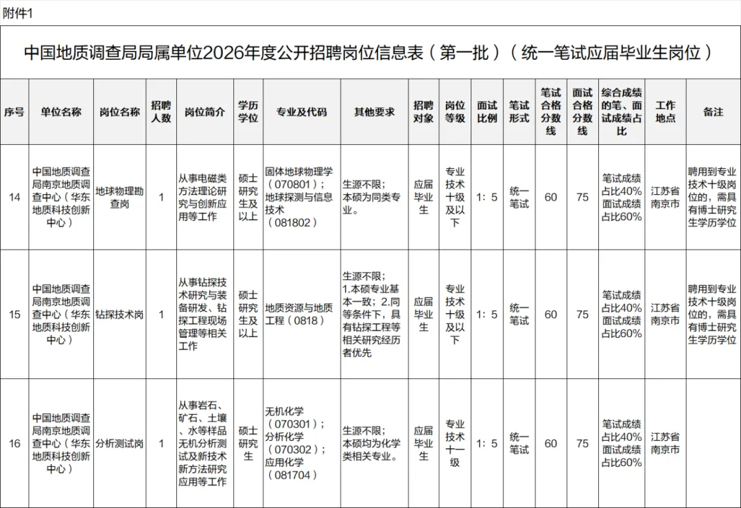 根据工作需要,按照事业单位公开招聘有关政策规定,现开展中国地质调查局局属单位2026年度第一批公开招聘工作。