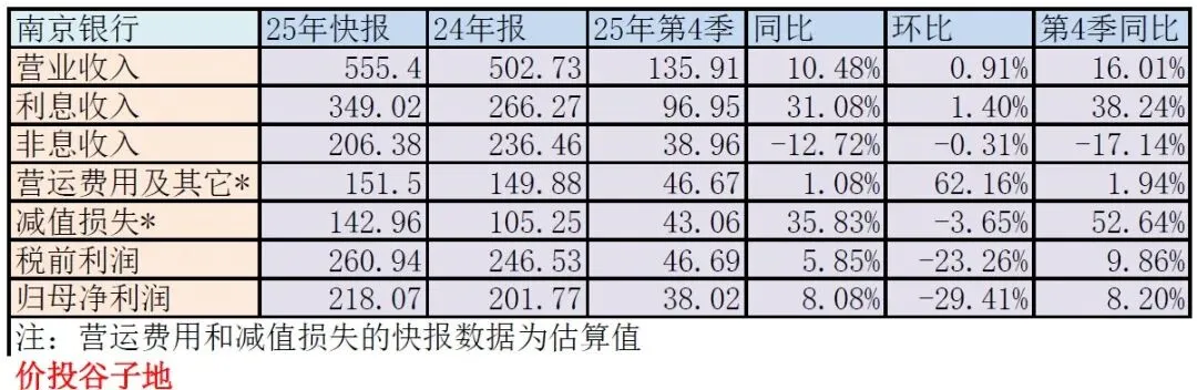 根据南京银行2025年的各期季报,营运费用及其他的同比增速依次为:一季报6.77%,中报6.14%,三季报0.7%,总体上呈现下半年增速快速下降。由此,我们可以对营运费用及其他按照同比增长1%估算。这样我们就可以推算出信用减值损失同比增长约35.83%。