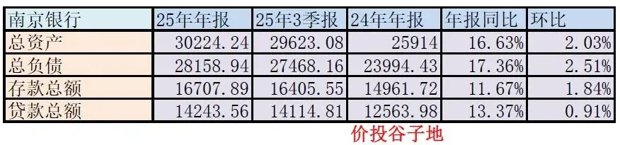 根据南京银行2025年业绩快报披露:总资产30224.24亿元,较上年末增长16.63%;总负债28158.94亿元,较上年末增长17.36%,更多的数据如下表2所示: