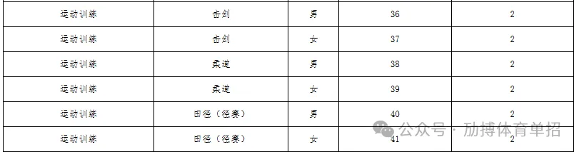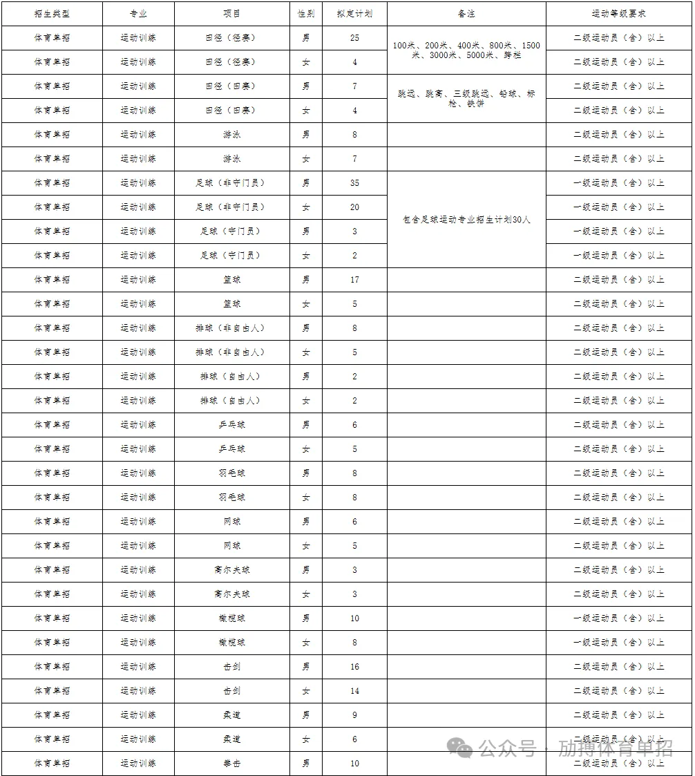 招收二级运动员(含)以上的项目:田径(100米、200米、400米、800米、1500米、3000米、5000米、跨栏、跳远、跳高、三级跳远、铅球、标枪、铁饼)、游泳、篮球、排球、乒乓球、羽毛球、网球、高尔夫球、击剑、跆拳道、柔道、拳击、体操、艺术体操、技巧。