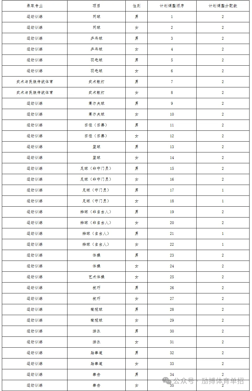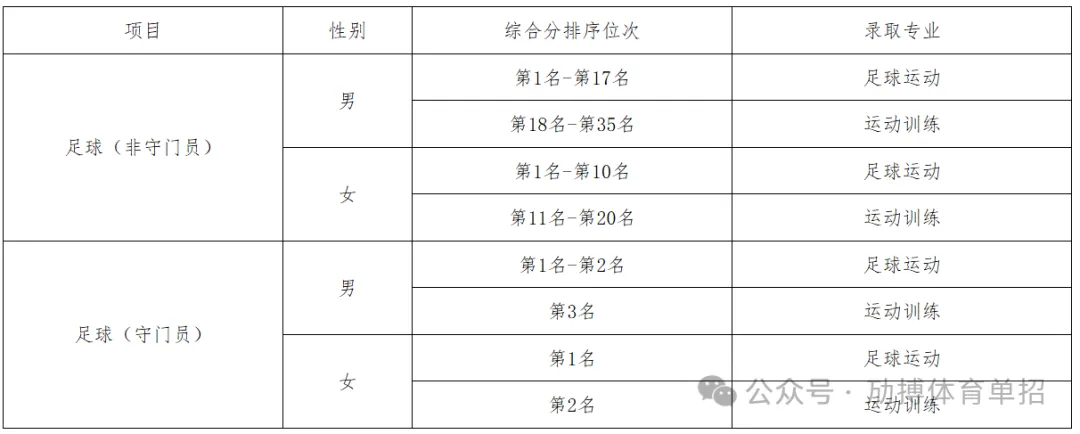 4.跳水、蹦床项目不分男女录取,其他项目均按性别分别进行录取。田径项目按田赛、径赛两类分别录取;排球项目按非自由人、自由人分别录取;足球项目按非守门员、守门员分别录取。足球项目考生在进行专业分配时,按照综合分排序,优先录取至足球运动专业,录满后再录取至运动训练专业,具体如下: