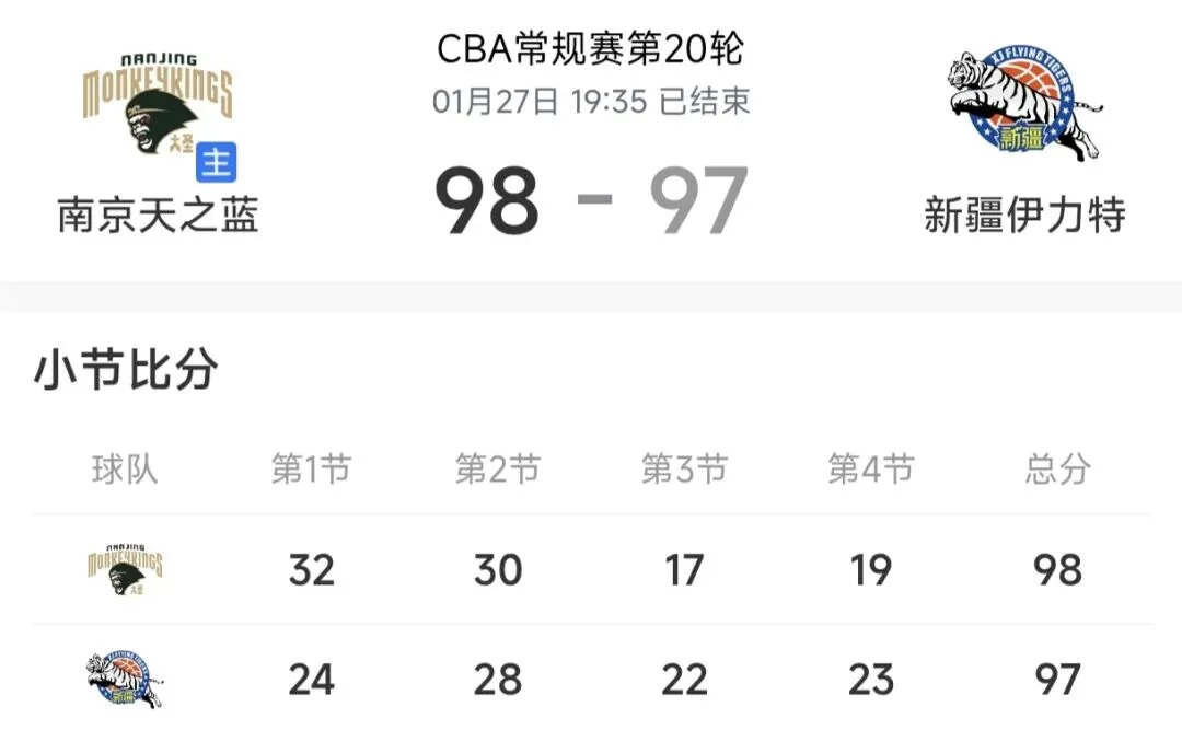 北京时间1月27日晚,CBA常规赛第20轮,南京男篮(同曦)主场以98-97险胜新疆男篮,终结自身4连败,同时也终结了新疆的3连胜。