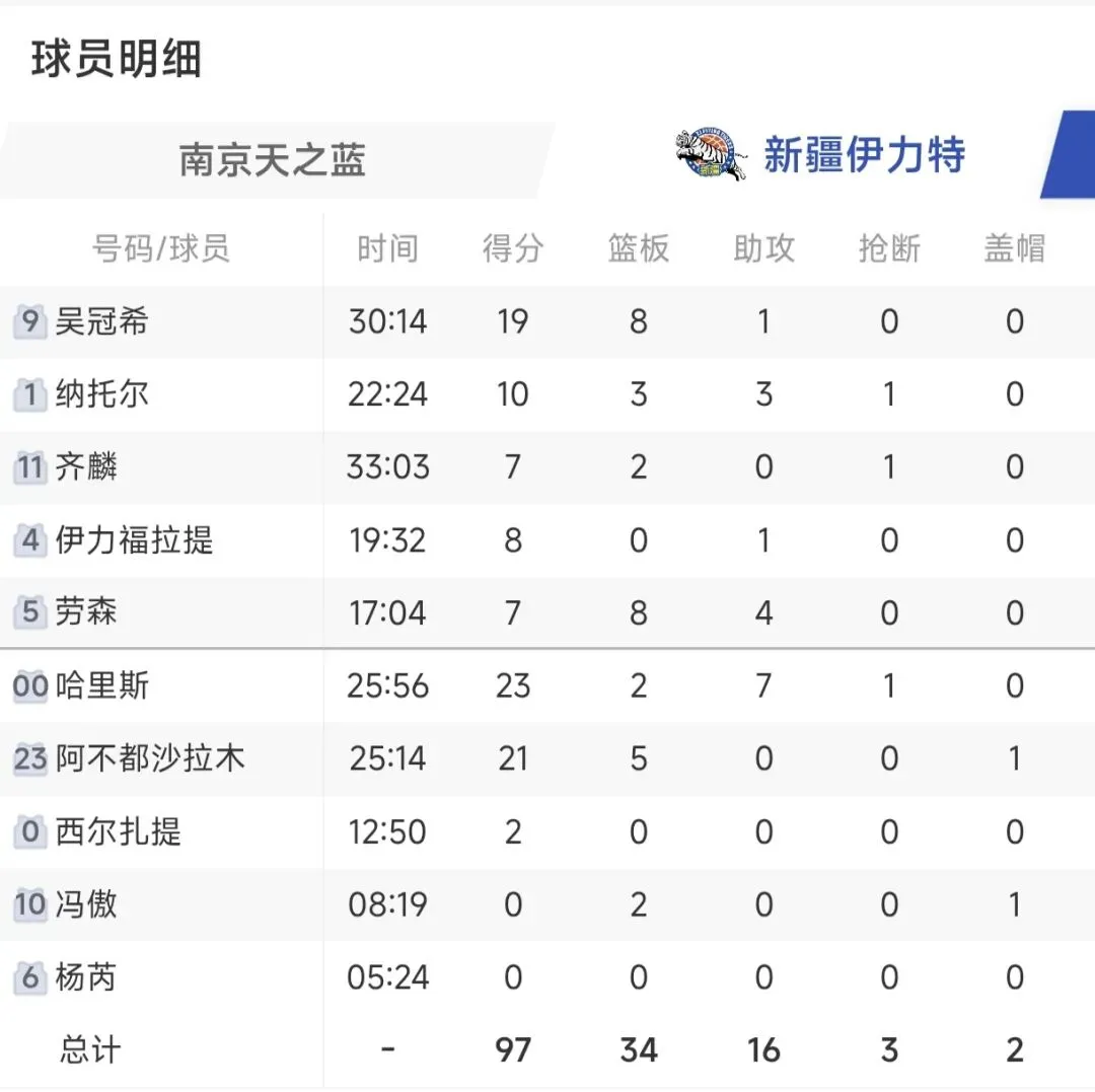 - 新疆:哈里斯23分7助攻,但末节多次失误、罚球失手;阿不都沙拉木21分5篮板,末节命中关键三分却难挽颓势;吴冠希带伤(肋骨骨裂)出战贡献19分8篮板,内线极具威慑力。