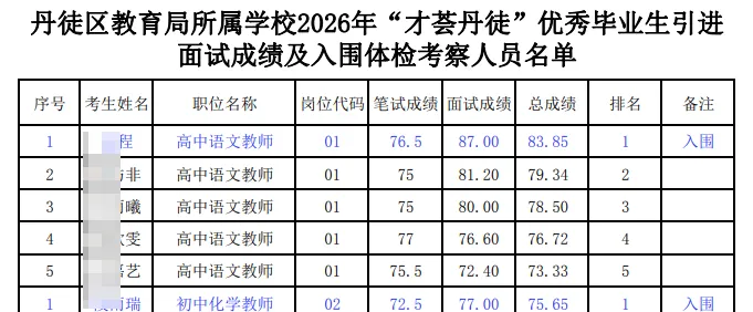 2026年江苏镇江丹徒区教育局所属学校“才荟丹徒”优秀毕业生引进面试成绩及入围体检考察人员公示