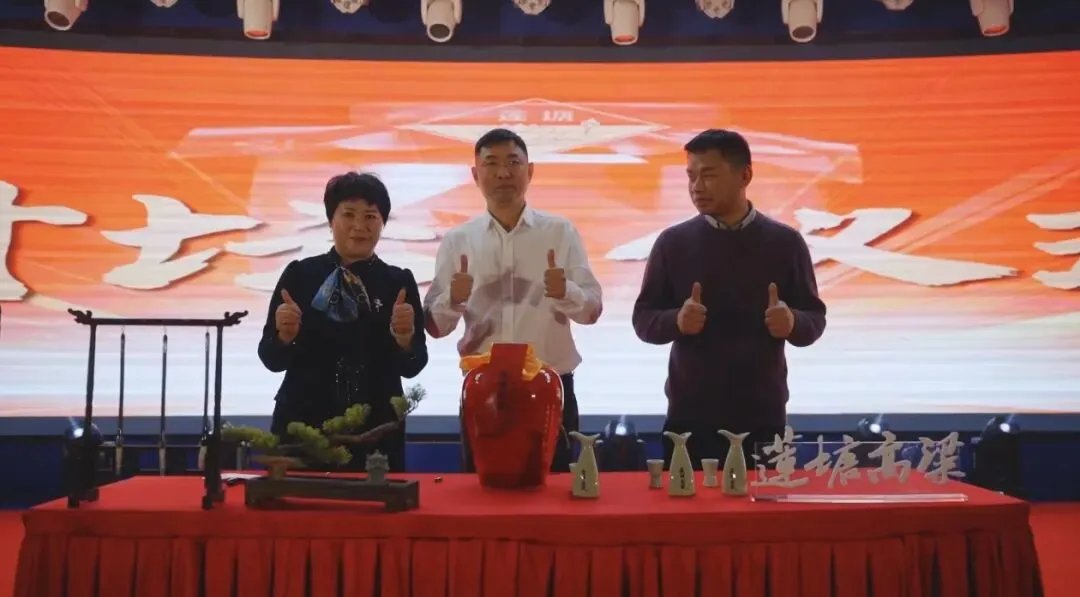 邰庭红女士、黄国海会长、杨辉福执行秘书长--封坛仪式 会议结束后,由江西莲塘酒业销售有限公司总监邰庭红女士为庆祝南京市安义商会联谊会,赞助老家的“莲塘佳酿”,并举办了隆重的封坛仪式。