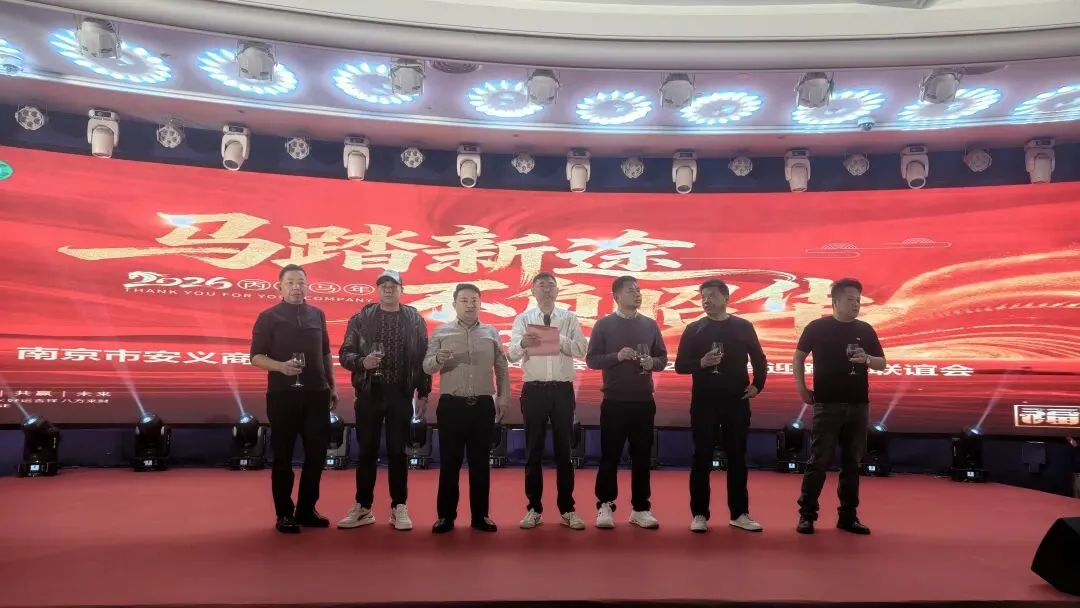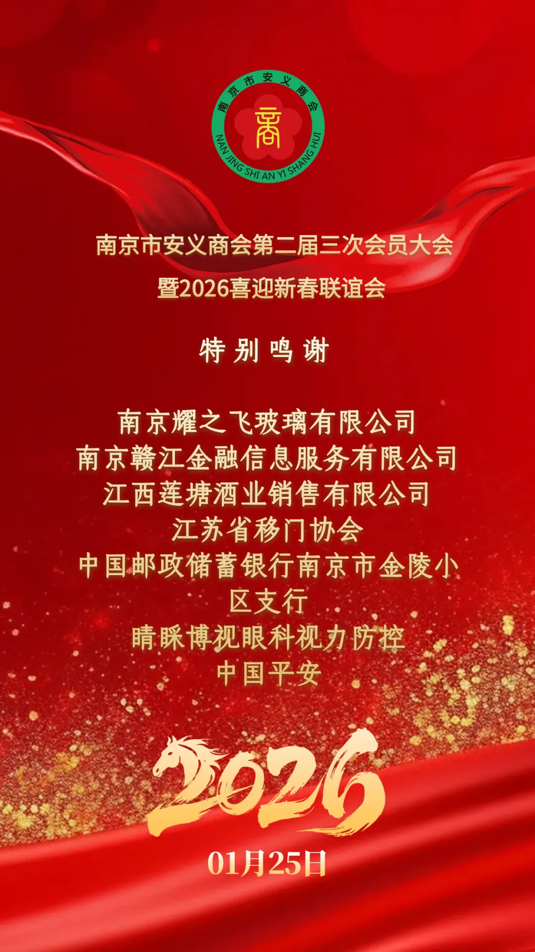 2025年1月25日,金陵城华灯初上,南京市安义商会第二届三次会员大会暨2026年喜迎新春联谊会,在南京白金汉爵酒店隆重举办。政企领导、会员代表及乡贤齐聚一堂,共叙乡情、共谋发展。会场内,红金主题背景与安义古建筑剪影交织,传递着红火与希望的气息,仿佛一场温暖的‘宁安家宴’拉开帷幕。”