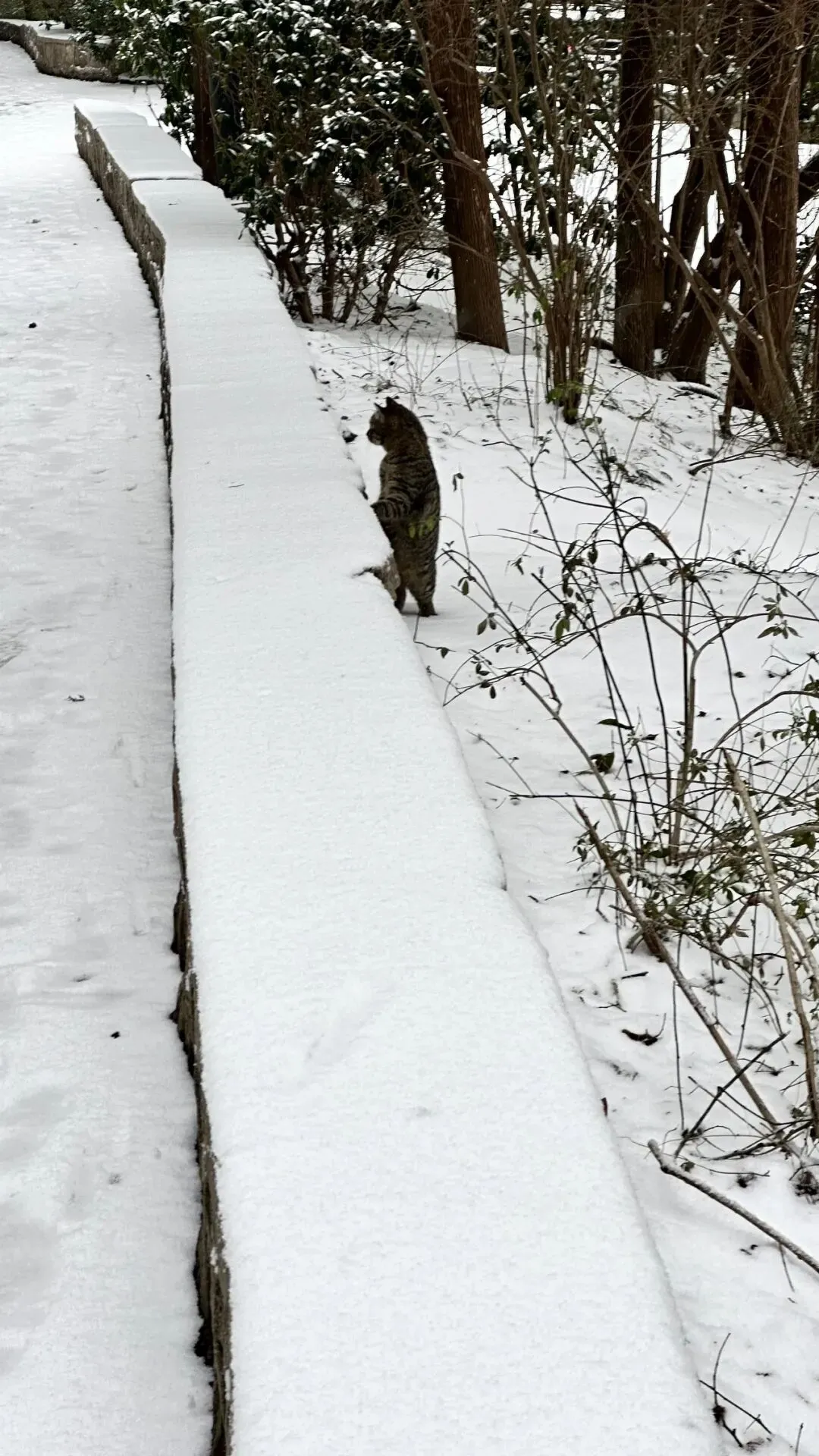 爬到山顶时,雪又开始飘了,站在亭子里往下望,整座山银装素裹,毛孩子常出现的地方还历历在目