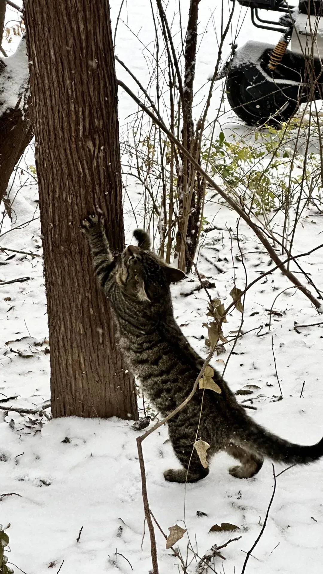 往前走,另一只毛孩子正用前爪扒着树干,仰头向上闻闻,仿佛在标记这片它的领地