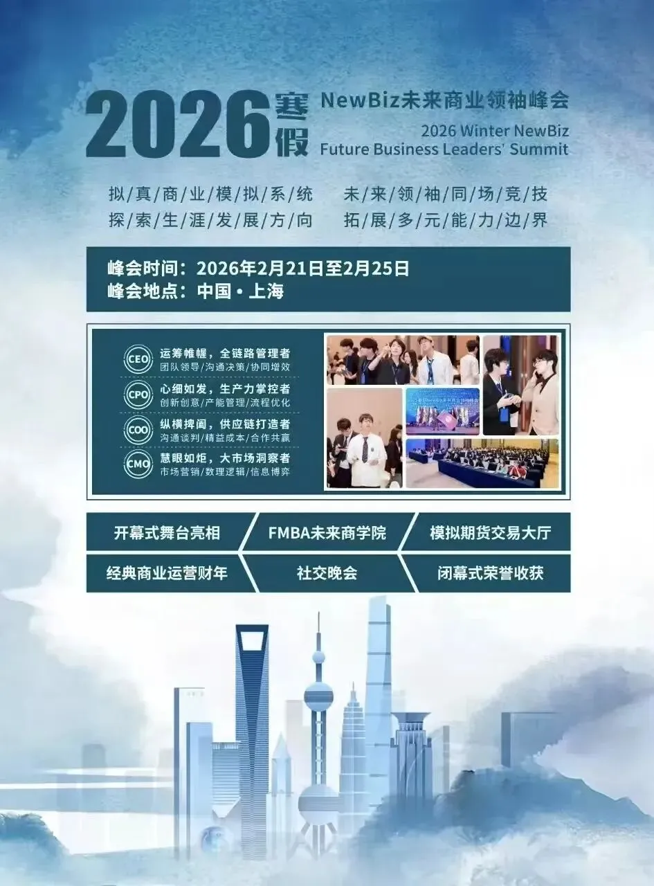 2026年寒假,NewBiz未来商业领袖峰会已敲定档期 ——2月21日至25日将在上海启幕。它承续校园实践的成长内核,以拟真商业模拟与多元能力竞技,邀学子们共赴更广阔的商业新征程!诚邀你共赴未来更多精彩的商业探索征程!