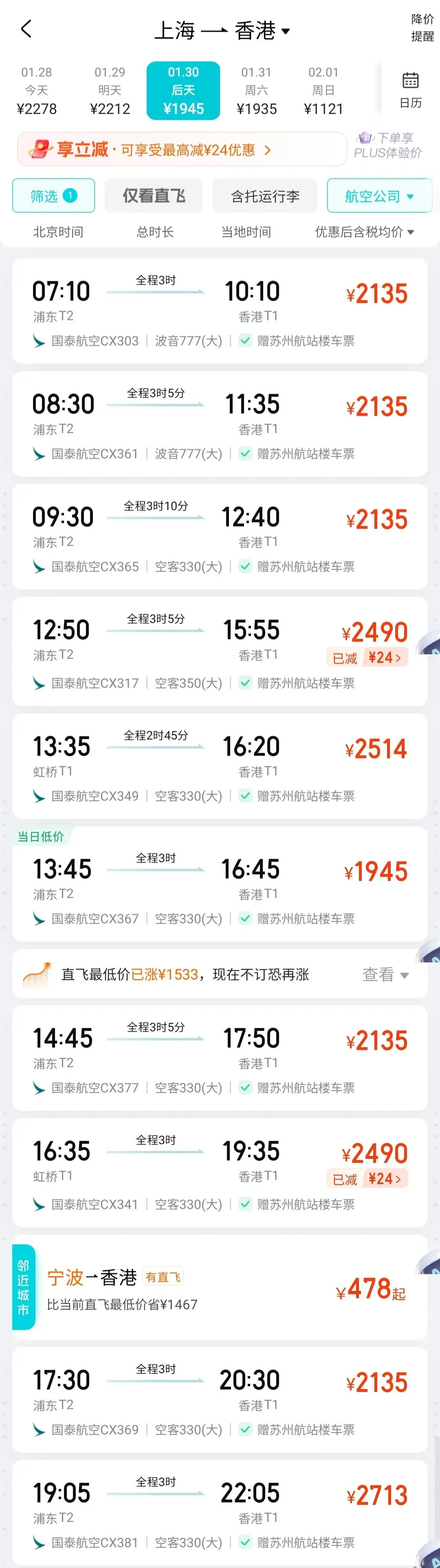 上海浦东=香港每日往来航班量接近30班,两大全球顶尖航空枢纽实力不俗,其中国泰航空日常往来两地航班量可以做到每日10班,而且全是宽体执飞,机型以空客A330为主。