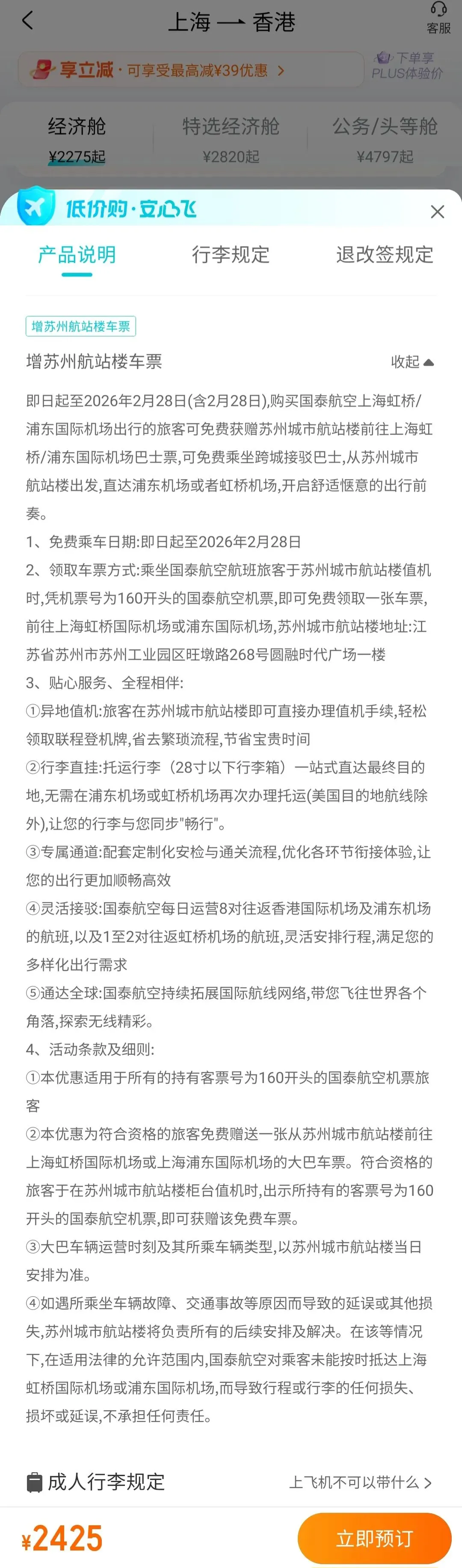 即日起至2月28日,购买国泰航空从上海飞香港的航班旅客将获赠苏州城市航站楼前往上海机场的巴士票。